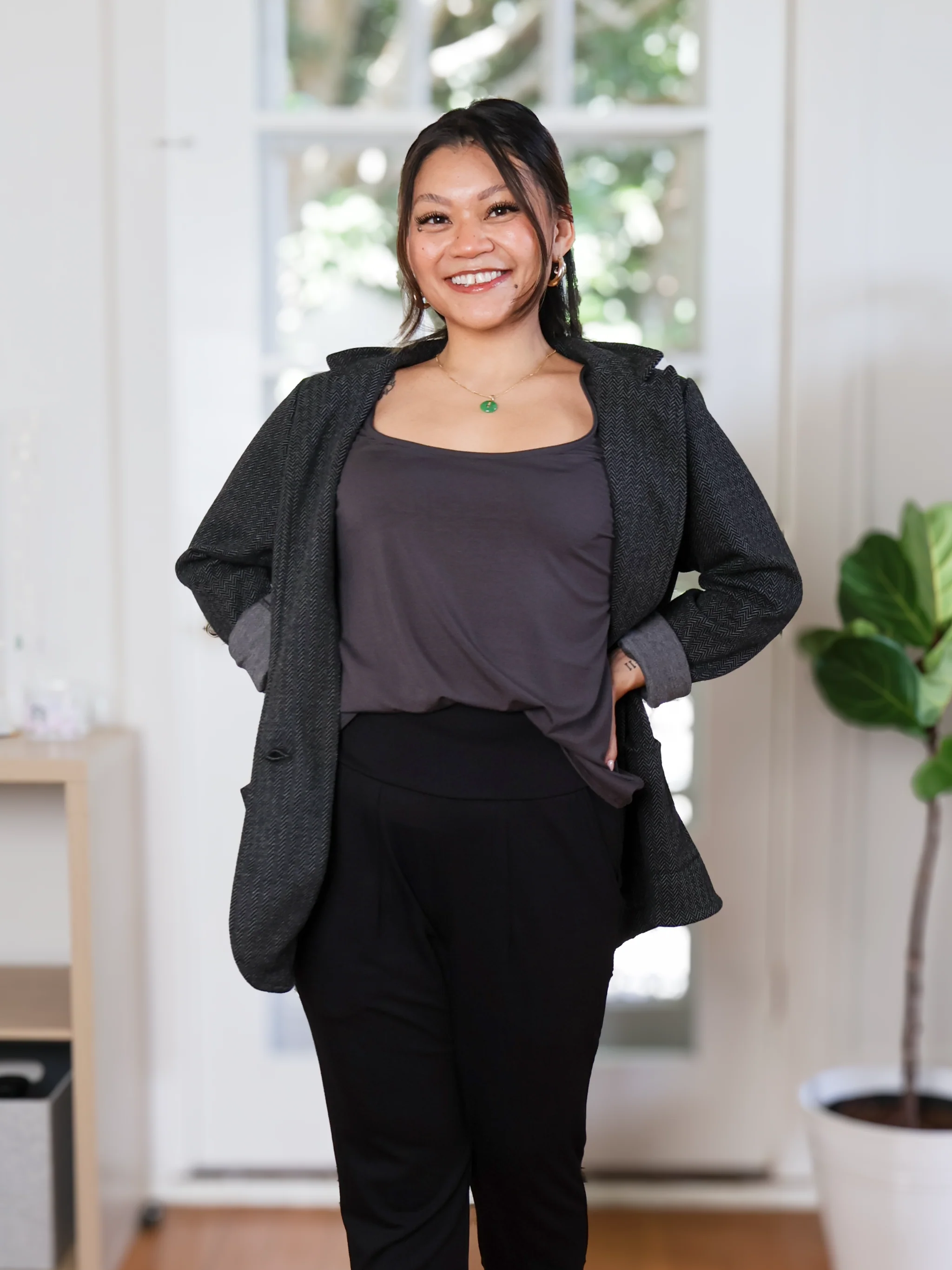 Designed to be worn either direction, Aidan gives you two neckline options: a slightly wider scoop or a higher scoop, depending on your preference. This is a top that layers smoothly and feels comfortable all day — no adjusting required.