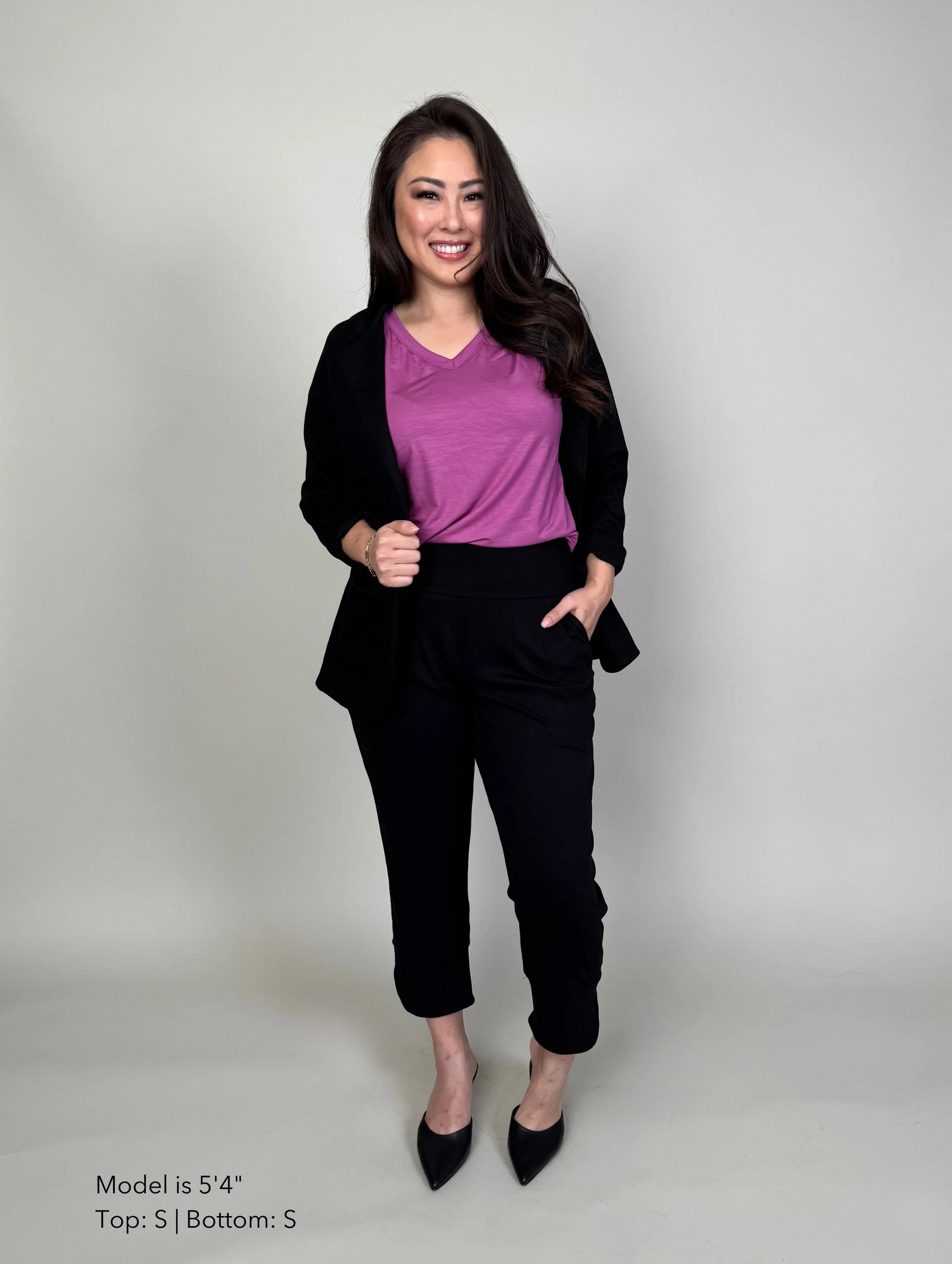 “When designing pants, proportion always comes first. What reads as cropped on one height may feel full-length on another — and that’s intentional. Miki was created to work across a range of heights without losing balance. My 5’6” sister, my 5’1” mom, myself at 5’2”, and customers who are 4’10” all wear this style comfortably. While no pant is perfect for everyone, Miki comes very close.”