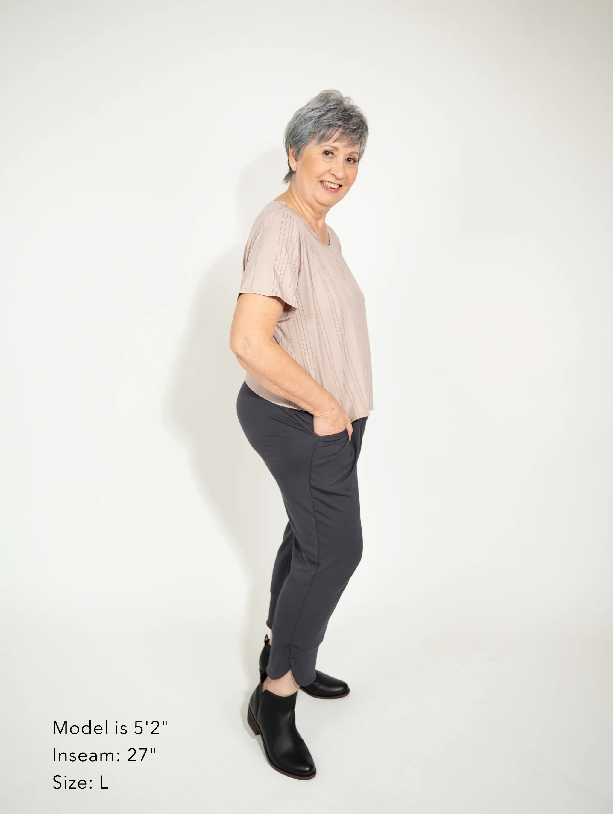 “When designing pants, proportion always comes first. What reads as cropped on one height may feel full-length on another — and that’s intentional. Miki was created to work across a range of heights without losing balance. My 5’6” sister, my 5’1” mom, myself at 5’2”, and customers who are 4’10” all wear this style comfortably. While no pant is perfect for everyone, Miki comes very close.”