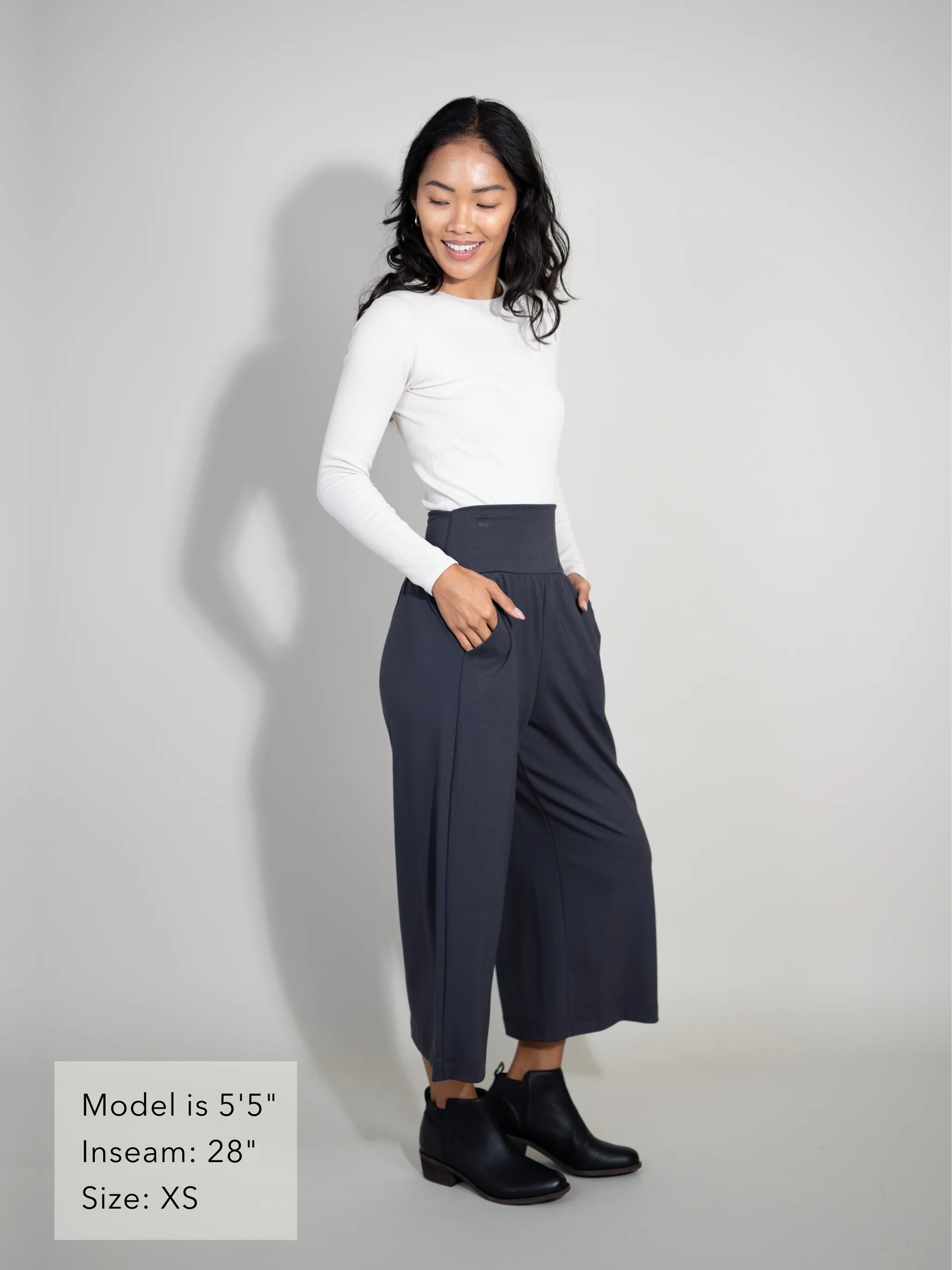 Meet the Milo Pant—your new go-to for effortless style and all-day comfort. Designed with our signature SmoothBand Waist that we designed to smooth and support your midsection while giving you the flexibility to wear it high or low, depending on your preference. The cropped wide-leg silhouette (21.5" inseam) is all about elongating petite frames, draping beautifully without overwhelming your shape. And let's talk about pockets—deep, slanted side-seam pockets that don't add bulk (because we don't need extra volume at the hips). The best part? Whether you're 4'10" or 5'6", the Milo is proportioned to flatter, hitting at just the right length for a perfectly balanced look.