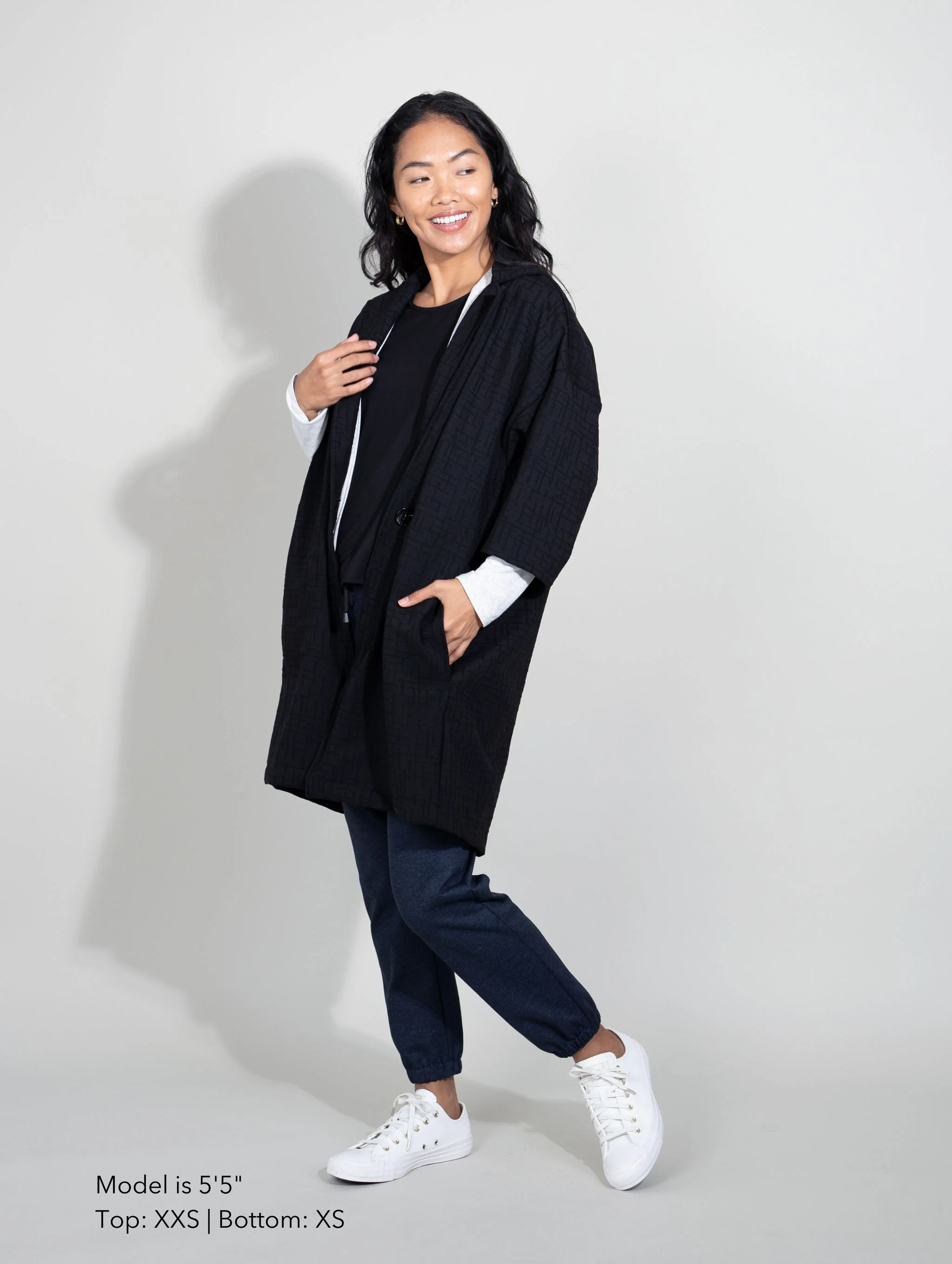 A long, oversized menswear inspired coat with 3/4 sleeves, front pockets, and a single button closure.