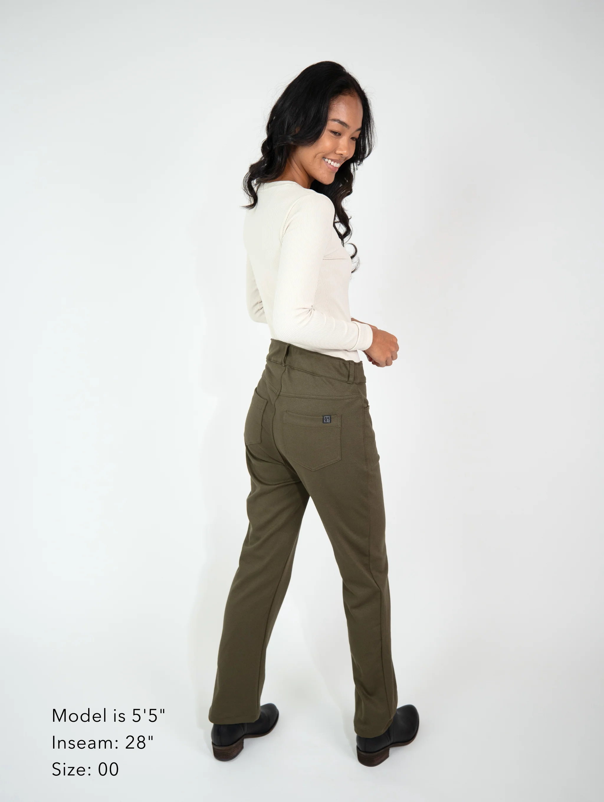 FIT: The fitted waist has comfort from stretch that the half elastic waistband provides. The legs have a looser fit in the hips and thighs and shapes straight down the thighs to the ankle.
